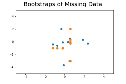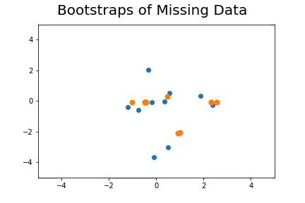 The second method, which is the method we described in our paper uses bootstrap to determine a measure of robustness. Below we applied bootstrap to the Gaussian data and applied EM to determine the cluster means and plotted them.