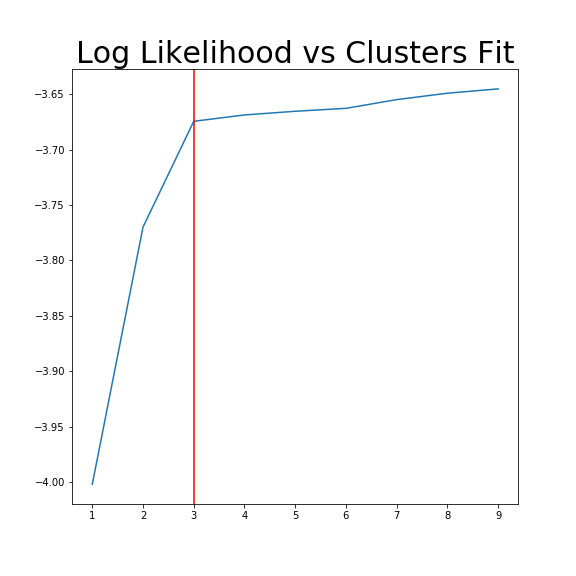 One way is by assessing the Log Likelihood vs Clusters fit. The more clusters fit, the higher the log likelihood, however we have a decreasing marginal rate of return. 3 clusters seems to be the point at which fitting more clusters gives very little improvement.